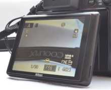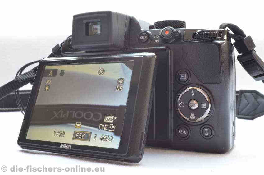 Diese Werte ähneln sehr stark denen der P80. Wo sind nun die Unterschiede? Auffälligstes Merkmal ist das in vertikale Richtung schwenkbare 3" Display, welches für die Fotografie von sehr kleinen Objekten - vor allem am Boden - optimal ist. Zusätzlich zum Display besitzt die P100 auch einen digitalen Sucher, der besonders bei einer hellen Umgebung von großem Nutzen ist. Der Autofokus nutzt mehrere Messfelder, welche auch frei ausgewählt werden können.