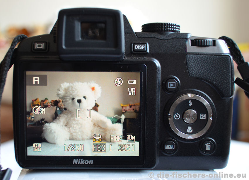 Neben dem 2,7" großen Farbmonitor besitzt die Kamera auch einen elektronischen Sucher, der besonders bei heller Umgebung sehr gute Dienste leistet, denn alle Statusinformationen werden auch werden auch hier eingeblendet. Neben dem optischenZoom besitzt die Kamera auch einen 4fach Digitalzoom, welcher fast gar nicht verwendet wurde, da die Bildqualität sehr darunter leidet. Die Ursache ist im Digitalzoom selber zu suchen: Die Bildvergrößerungen werden errechnet, was eben zu Folge hat, dass die vorhandenen Bildinformationen hochgerechnet (interpoliert) werden.